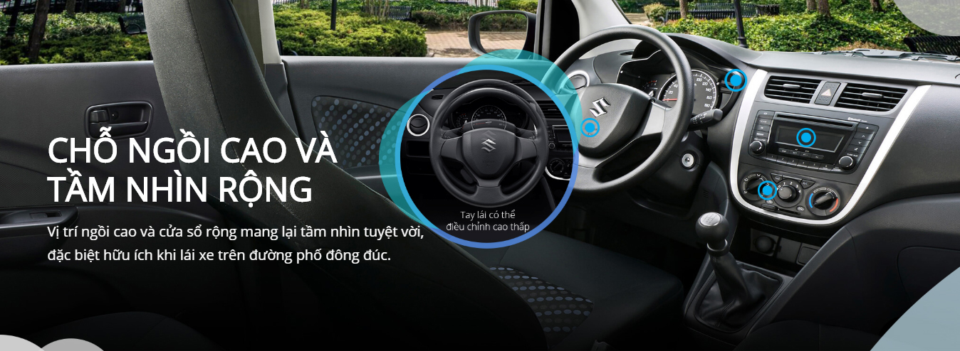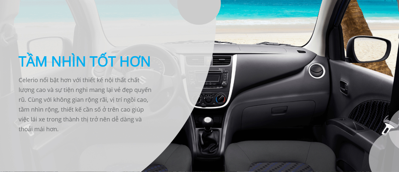 Celerio nổi bật hơn với thiết kế nội thất chất lượng cao và sự tiện nghi mang lại vẻ đẹp quyến rũ. Cùng với không gian rộng rãi, vị trí ngồi cao, tầm nhìn rộng, thiết kế cần số ở trên cao giúp việc lái xe trong thành thị trở nên dễ dàng và thoải mái hơn.