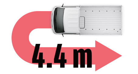 BÁN KÍNH VÒNG QUAY TỐI THIỂU Nhờ chiều dài cơ sở ngắn nên bán kính vòng quay tối thiểu của xe Super Carry Pro chỉ là 4,4 mét, cho phép bạn dễ dàng xoay trở trong một không gian hẹp.